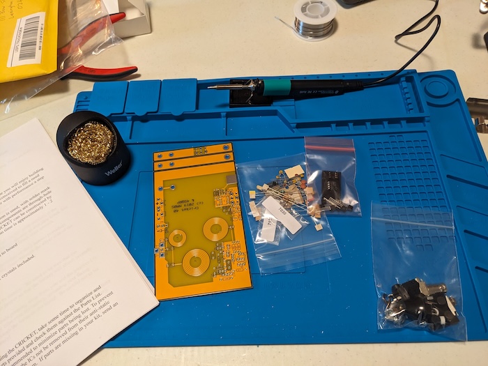 Here’s the kit as it comes out of the package. One nice aspect of the Cricket is that you don’t need to wind any toroids. The toroids are built right into the PCB board.