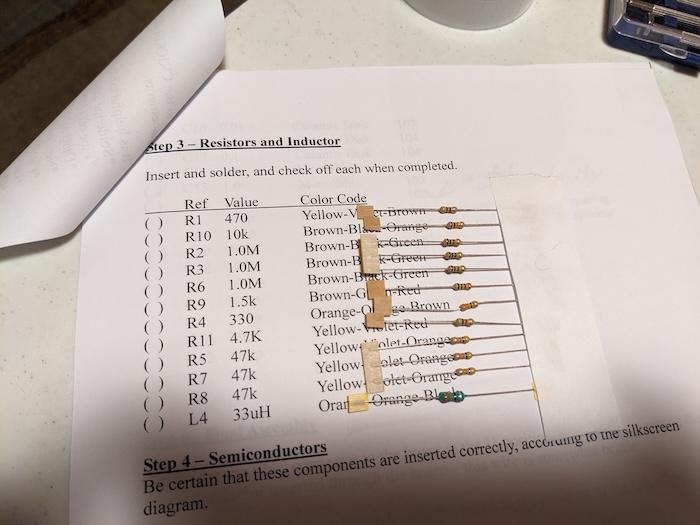 I didn’t want to make any mistakes by mounting the wrong resistor in the wrong place. Taping the resistors directly to their listing in the instructions allowed me to triple-check before soldering them onto the board.
