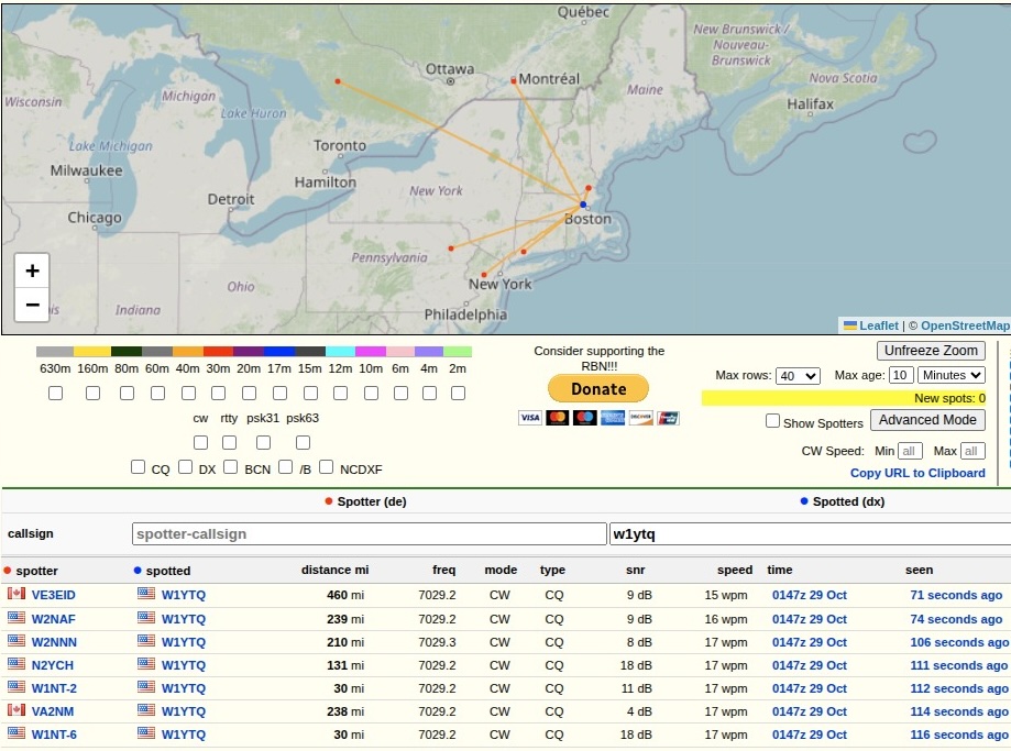 To my great joy, as soon as I plugged it in and turned the Cricket on, I was receiving Morse Code. I transmitted, and you can see my Reverse Beacon Network results below.