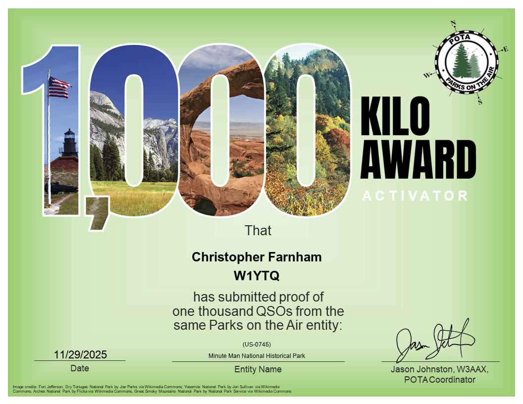 In late November, I earned my Kilo Award at Minute Man National Park (US-0745). To earn a POTA Kilo Award, an activator must make 1,000 or more contacts at a single POTA location.