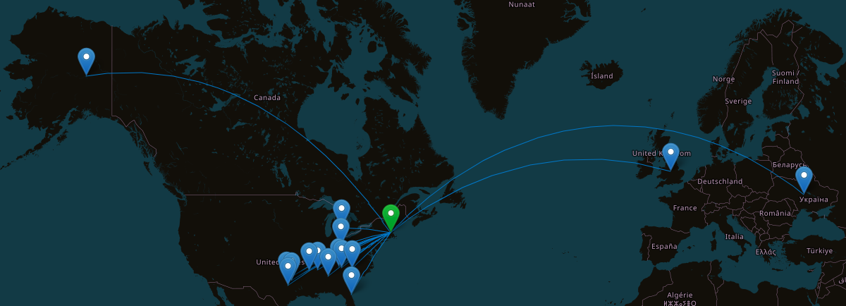Later, I got on her station to activate the park myself. Here is my contact map for the day. Notable contacts for me were Alaska and Ukraine!