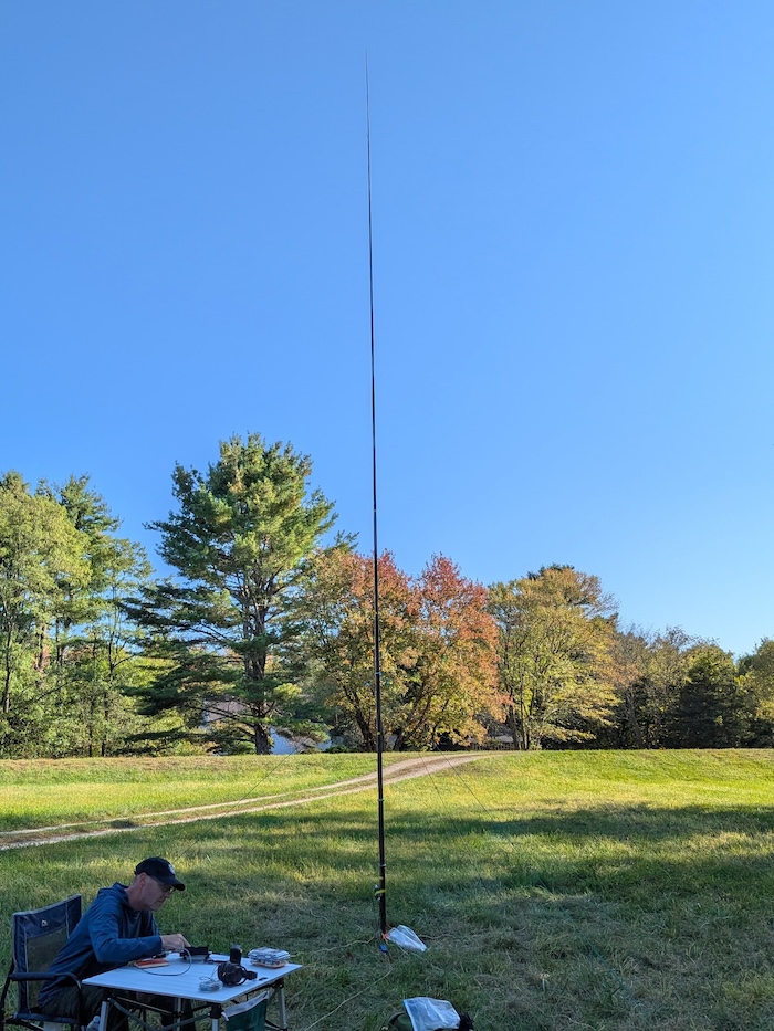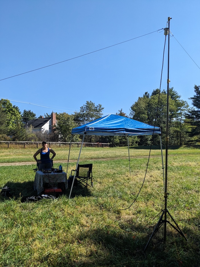 Later, when Adam showed up, we decided to set up another station using my Rybakov antenna. The plan was to use my Xeigu G90, but I cleaned out my field kit the night before and left my power cable at home! Luckily I had my KH1 with me and that has a tuner appropriate for the Rybakov, a non-resonant antenna.